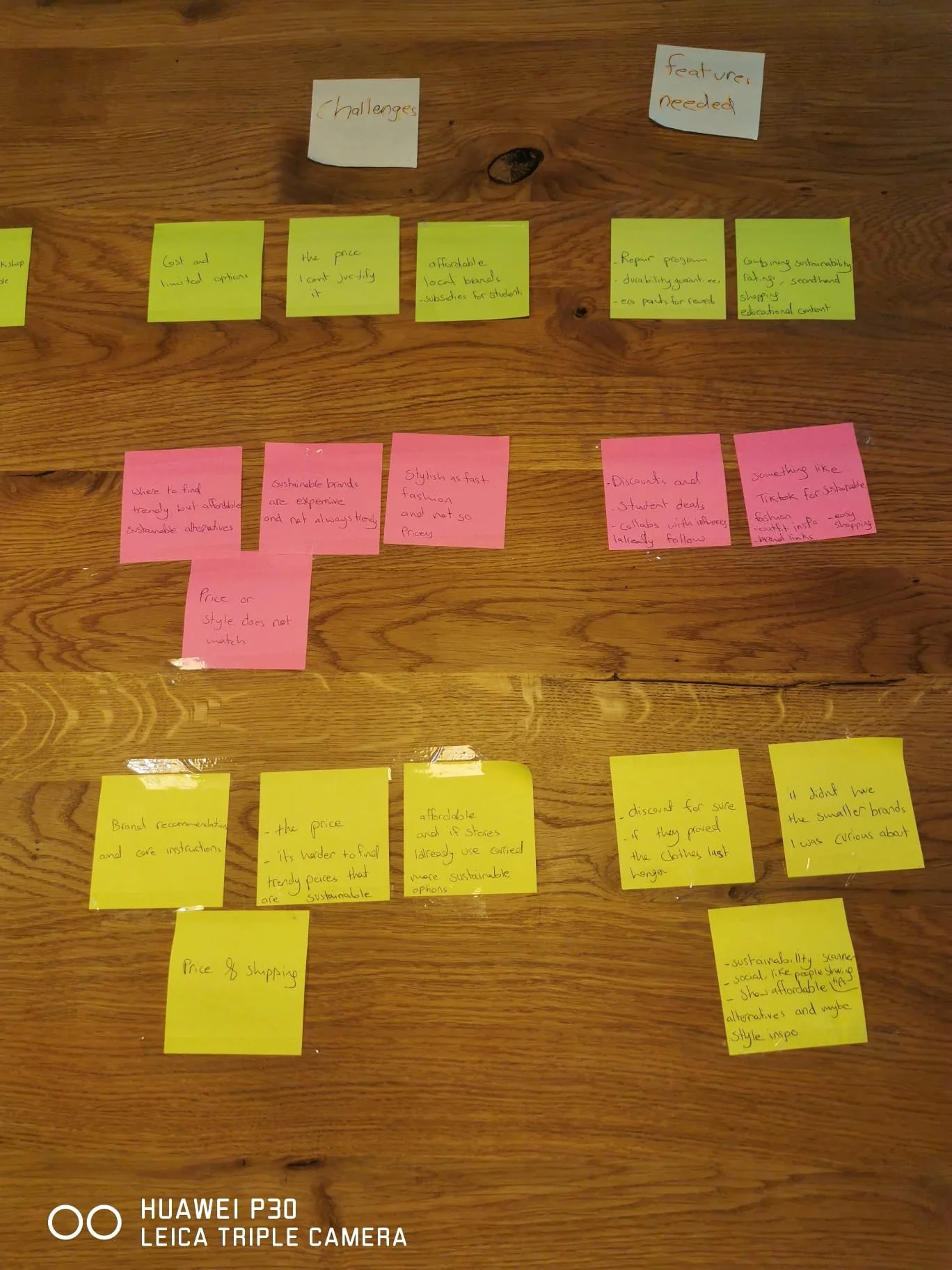 I used affinity mapping to synthesize insights from interviews and surveys, grouping user comments into clear themes such as wardrobe clarity, sustainable guidance, and motivation to reuse clothing. This process highlighted the strongest user needs and directly informed the app’s feature direction.