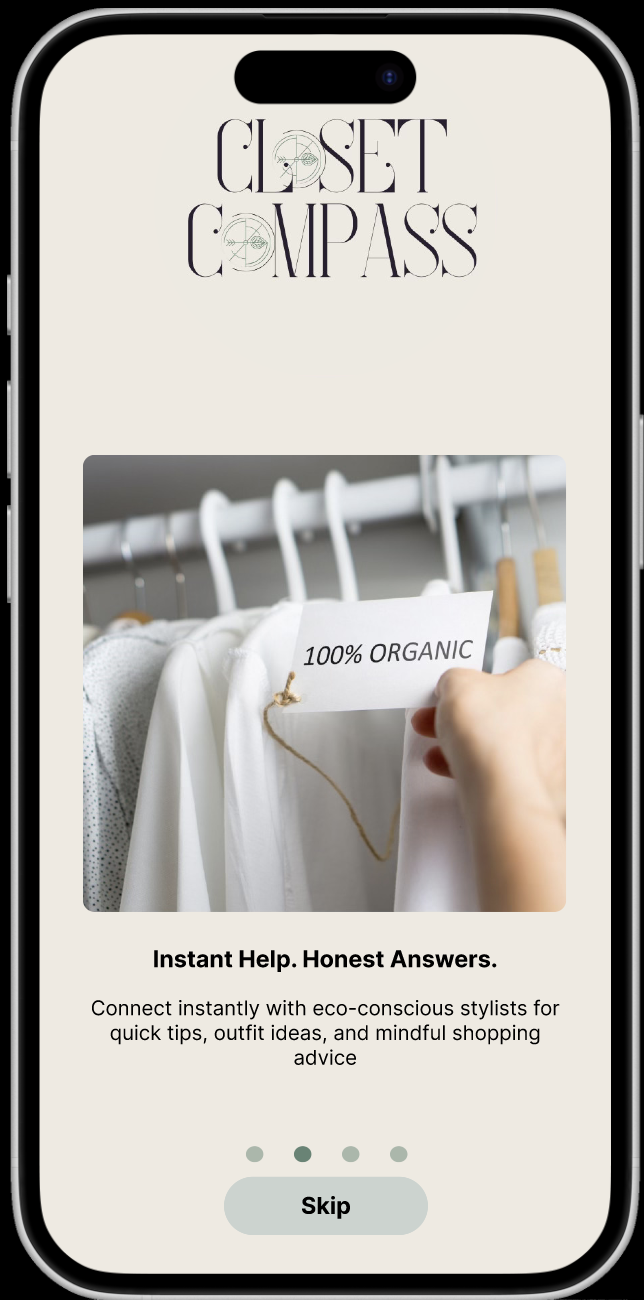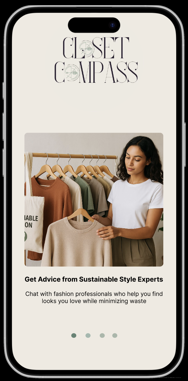 Closet Compass is a Sustainable Fashion Advice App connects users with real-time fashion experts who specialize in eco-conscious styling, wardrobe optimization, and ethical shopping. Its goal is to help people look great while reducing their environmental footprint through informed choices and responsible consumption.